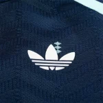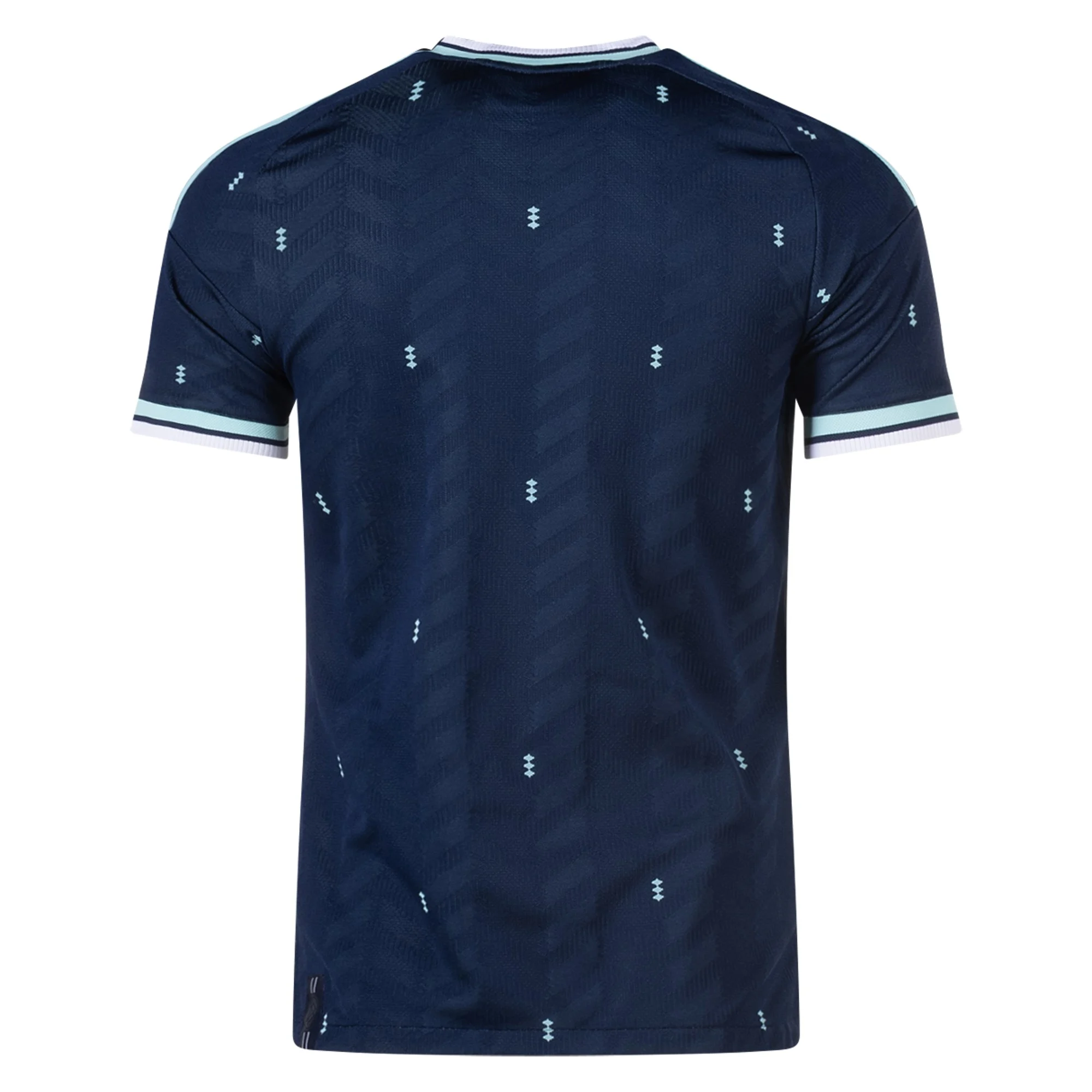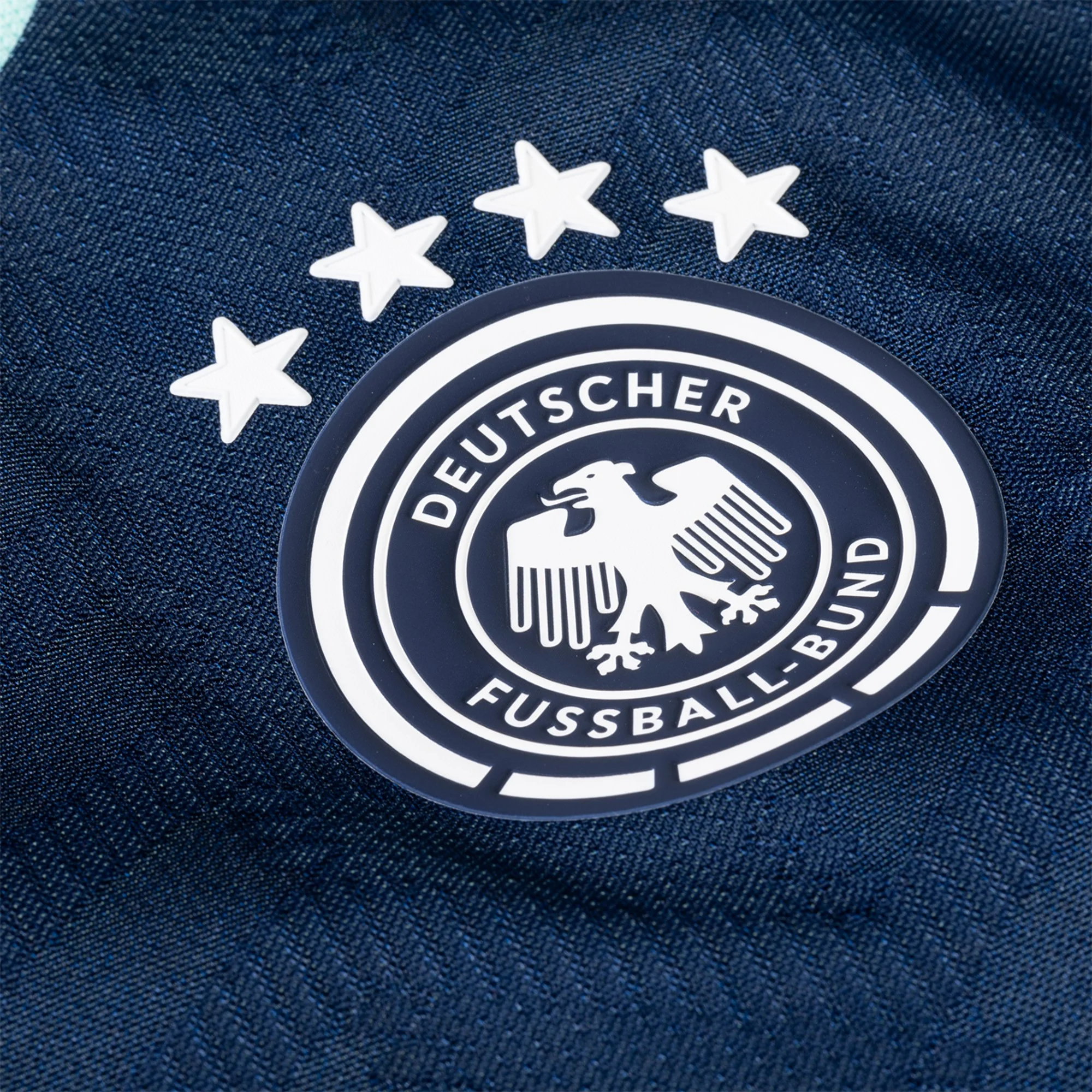 For their final away jersey with the German Football Federation, adidas revisit retro colors found on previous Germany jerseys, warm ups, anthem jackets and pre-match tops. A navy base comes flanked with minty accents for an almost maritime color palette combination. In an all-over repeating pattern, chevrons launch up the kit, while a stack of three miniature diamonds descends in equidistant harmony. The chevrons and diamonds call to mind myriads of previous adidas and Germany tops, and serve as a graceful final sign off from the Three Stripes.
