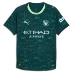 City collaborate with EA Sports for yet another winning top, but this time it’s IRL. In 23/24, the Citizens released a special 4th kit in collaboration with EA Sports… but it was only available digitally for City to wear in EA FC. Now, the kit arrives in a real, physical edition. The 25/26 Man City Fourth jersey is not locked inside a video game but available to wear in person – featuring a digitized look using soft neon blues and greens in a triangular patter to mimic the EA FC branding for the 25/26 season.
