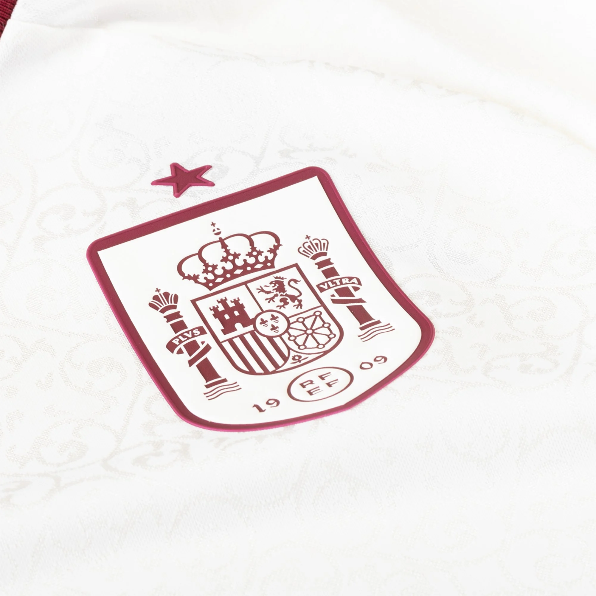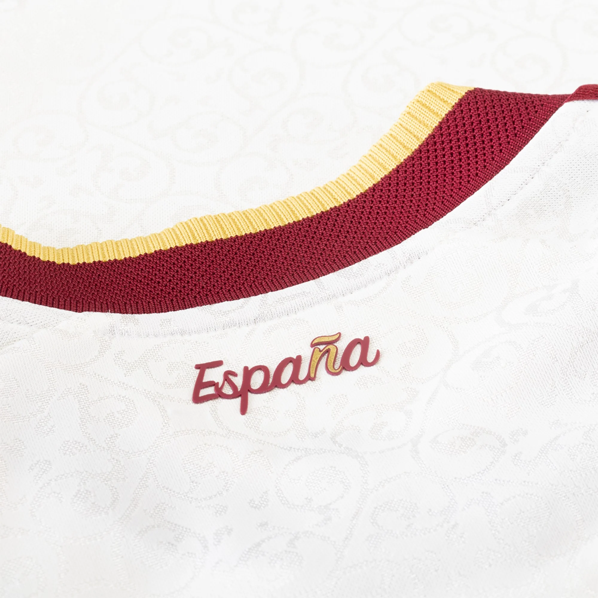 Spain’s 26/27 away jersey is rooted deeply in the country’s cultural history. The kits base hints at faded colors and timeless history with its off-white color palette. Resting on top, a gorgeous maroon arabesque element repeats in an all-over pattern around the kit.